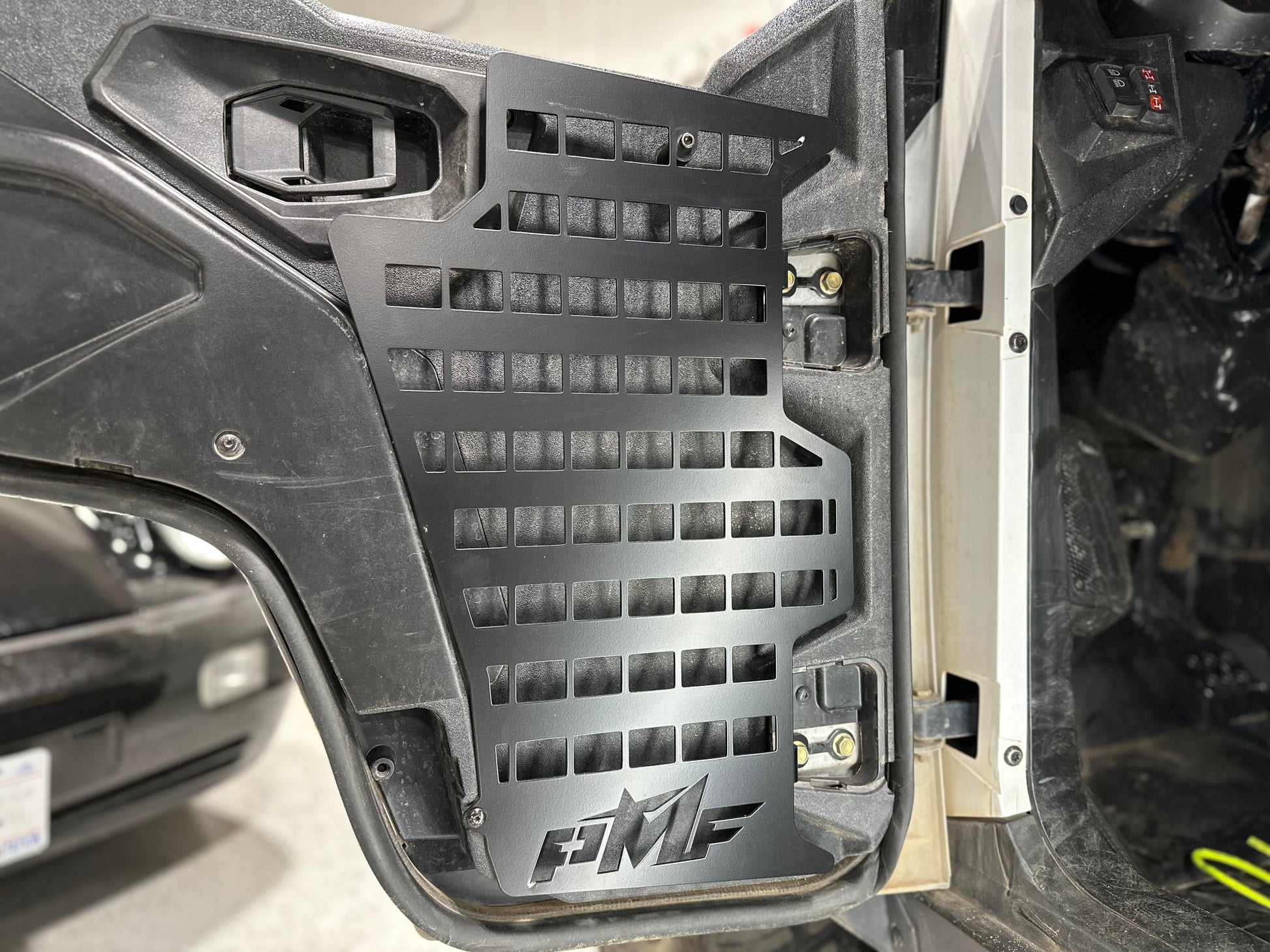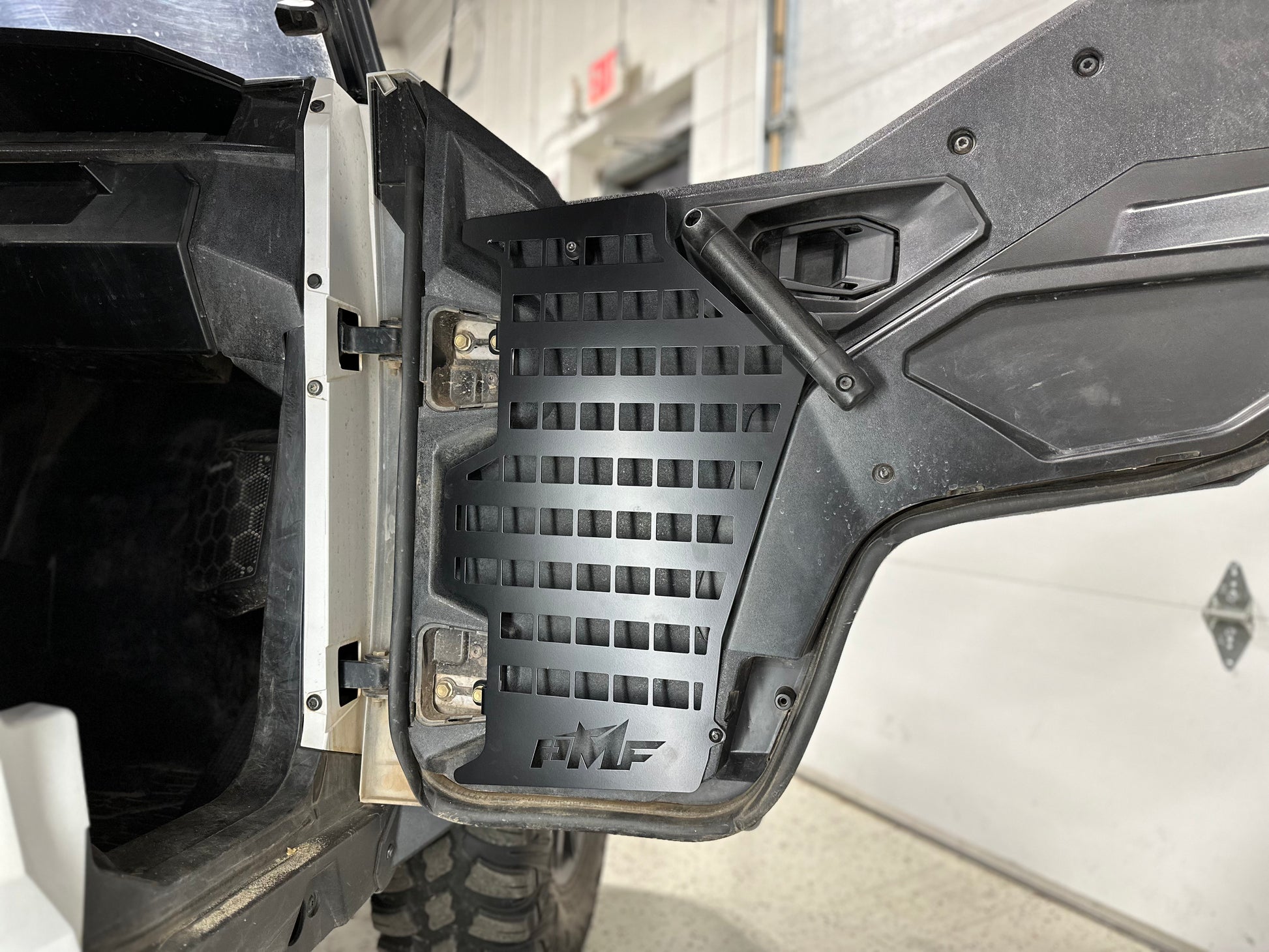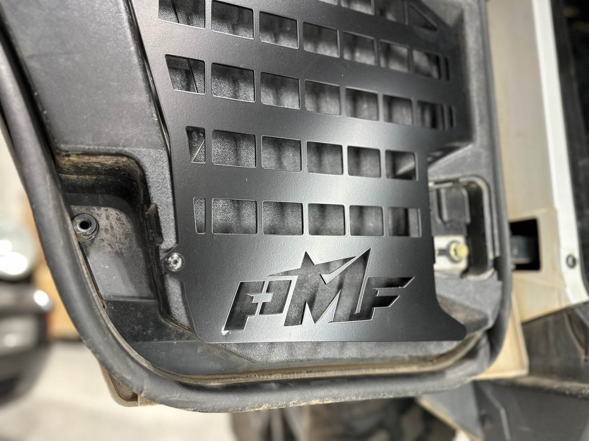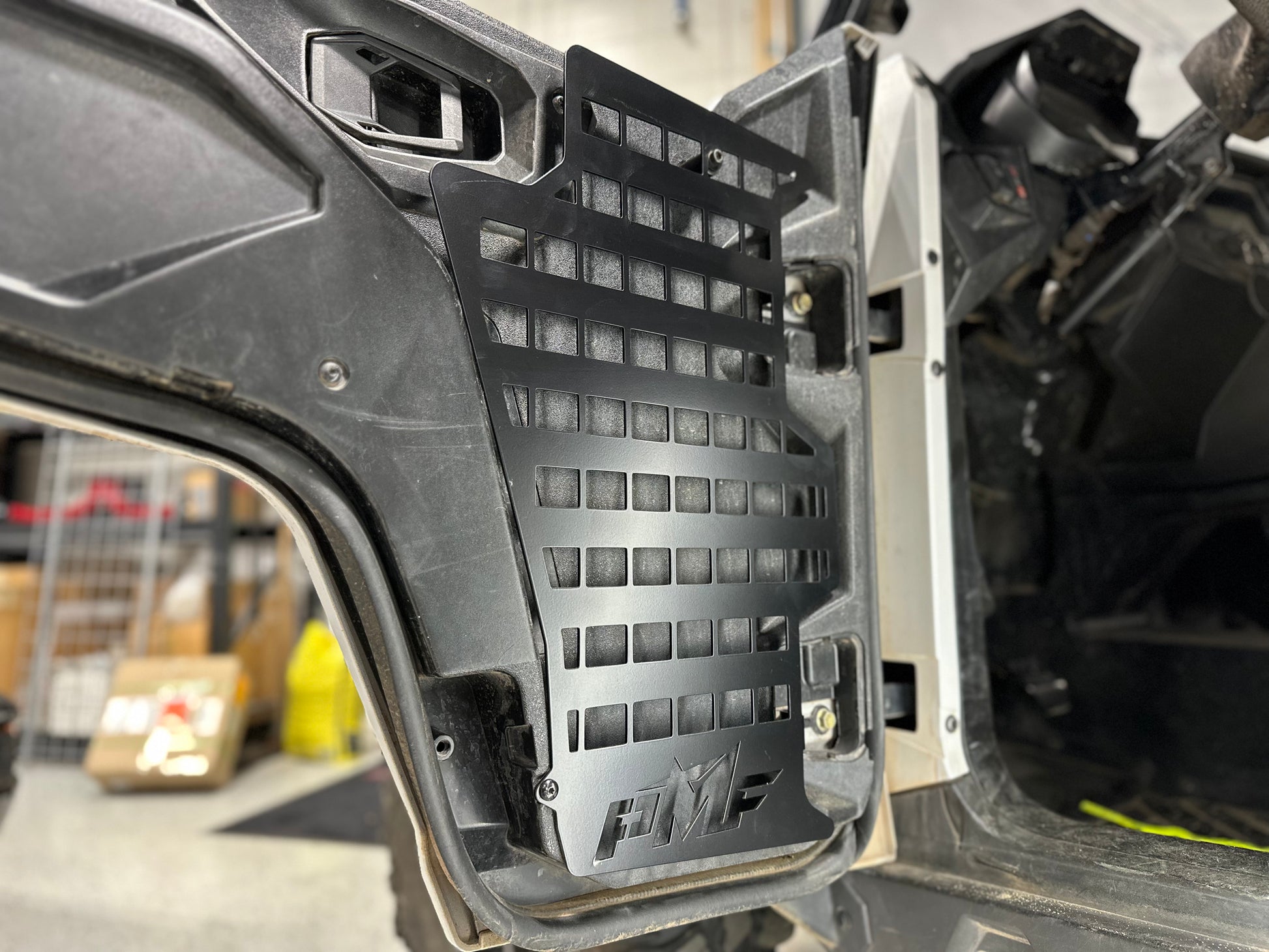 We're incredibly excited to introduce the first set of Patience Metal Fab Side-by-Side "GO GRID" Molle Door Panels for the Polaris General. These units are precision laser cut from lightweight, incredibly strong aluminum, finished in a durable black powder coat and designed to be a direct bolt-in product with no modification required (slight trim on door hinge covers is optional if you want to use them). These are designed with standard/basic molle webbing size for universal fit with thousands of existing accessories and the first of many chassis-specific PMF "GO GRID" Panels coming for your General, RZR and more!