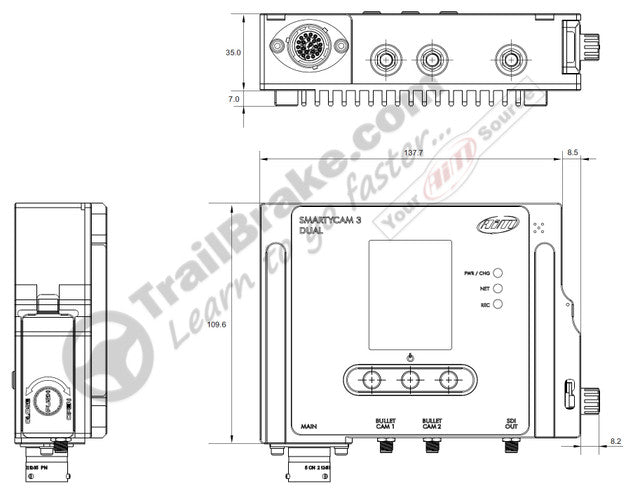 How do we explain the flagship SHCD 3 Dual? The most advanced SmartyCam made, it features dual 1920 x 1080 video at up to 60 fps through the optional 67, 84, or 120 degree lenses of the bullet cameras. The video overlay and Picture in Picture is processed real time and written to the full size SD card (up to 2 TB) and internal 64 GB SSD if equpped. Connection to AiM devices is easily handled through the 5 pin 712 Binder cable, but the internal ECU bridge make connection directly to the car's ECU or other data systems a simple 2 wire connection. With the ability to bring in external audio and have an ethernet connection, the SCHD 3 Dual is a powerhouse.